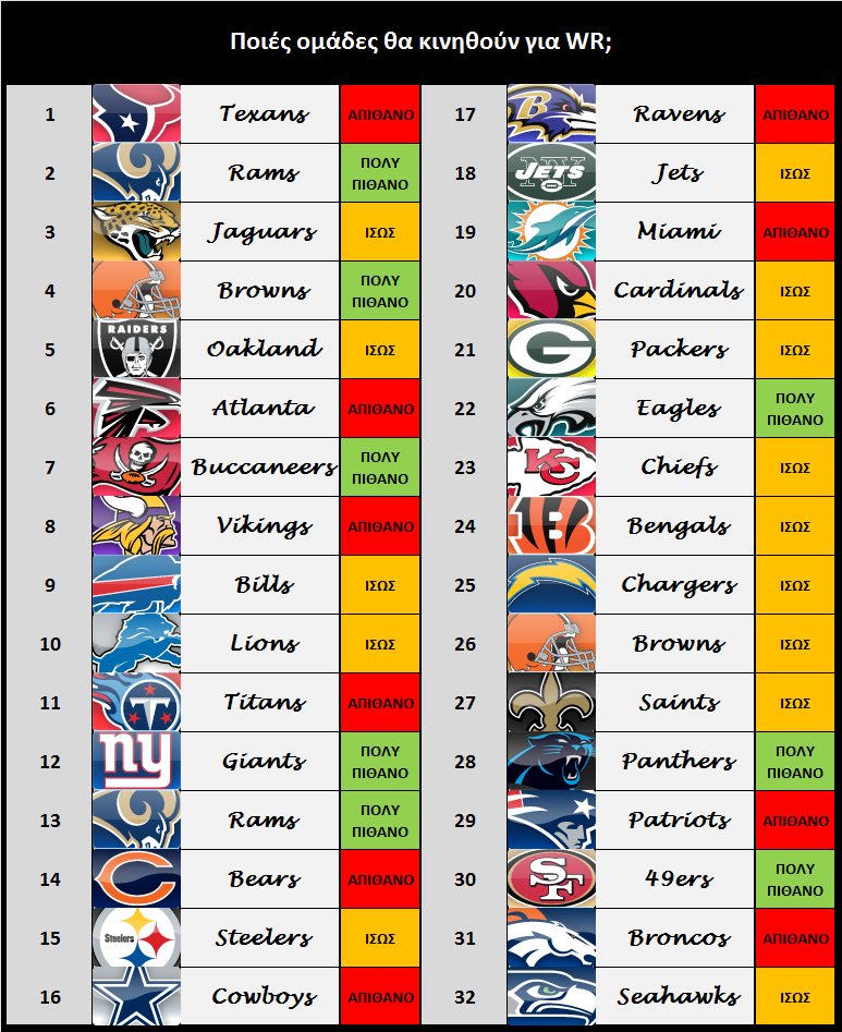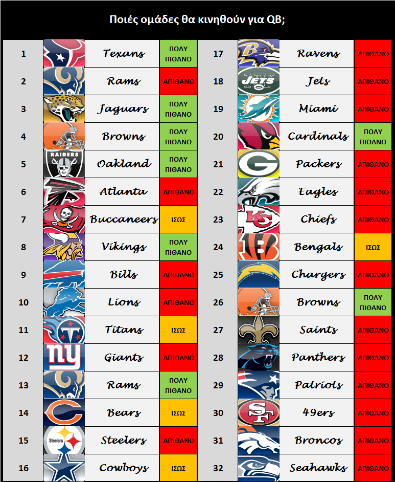 Τέλος συνοψίσαμε τις “ύποπτες” θέσεις που μπορούν να επιλεγούν οι πιο “δημοφιλείς” θέσεις στο draft, αυτές του QB, WR, OT και DE/OLB. Υπενθυμίζουμε ότι οι λίστες αυτές αφορούν τις επιλογές κάθε ομάδας μόνο στον πρώτο γύρο.