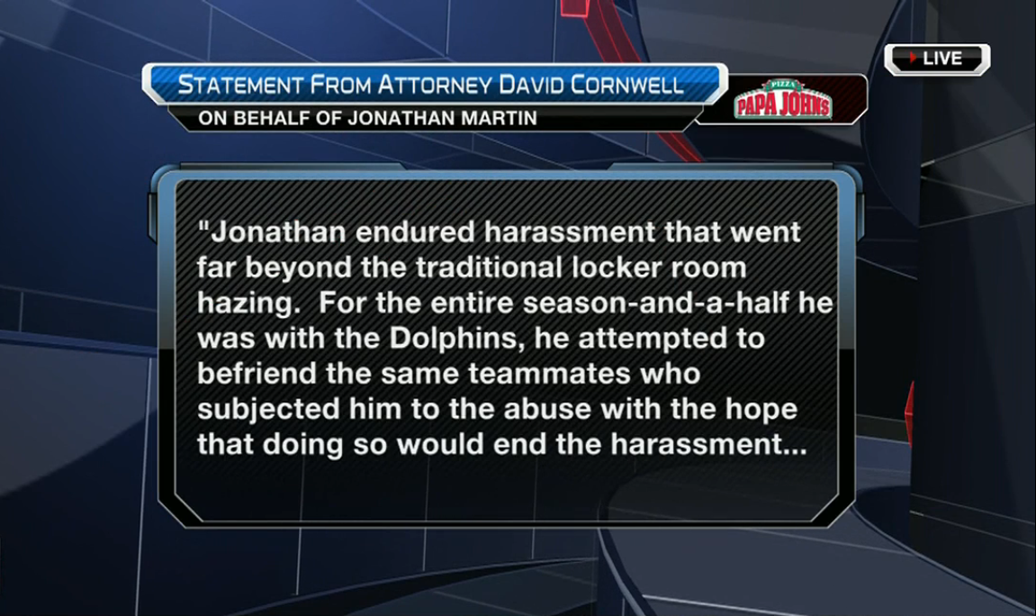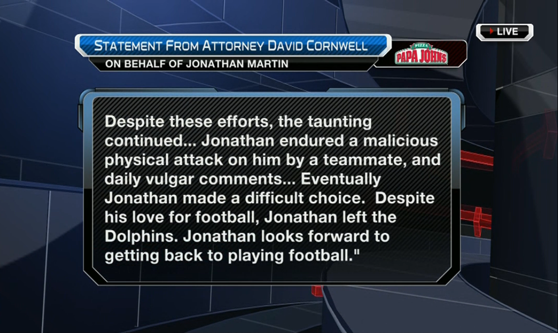 Η υπόθεση των Incognito-Martin έχει προκαλέσει πολλές συζητήσεις τον τελευταίο καιρό στο NFL. Η συζήτηση δεν επικεντρώνεται τόσο στο συγκεκριμένο περιστατικό όσο στην ανάγκη ύπαρξης του “rookie hazing”. Η μετάφραση δεν είναι εύκολη. Πολύ περιφραστικά το hazing είναι η διαδικασία μύησης των rookies στην ομάδα, ύστερα από πολλές υποτιμητικές δοκιμασίες. Τέτοιες “δοκιμασίες” είναι η διοργάνωση του  rookie dinner, όπου οι “νέοι” κερνούν τους βετεράνους, τα περίεργα κουρέματα, το βάψιμο των μαλλιών, το κουβάλημα του εξοπλισμού από τους rookies ύστερα από κάθε προπόνηση κλπ. Πολλές φορές όμως τα πράγματα ξεφεύγουν και οι rookies αντιμετωπίζουν φραστική ή ακόμα και σωματική βία. Μία τέτοια ακραία περίπτωση είναι και ο Richie Incognito, ο οποίος αποτελεί έναν από τους πολλούς βετεράνους στα αποδυτήρια του NFL, που ασπάζονται αυτή τη νοοτροπία. Δυστυχώς για τον ίδιο, το θύμα του ήταν ο Johnathan Martin, συμπαίκτης του στην O-line και απ’ ότι αποδείχτηκε με ψυχολογικά προβλήματα. Ο Martin παρά το γεγονός ότι βρισκόταν στο 2ο χρόνο του στην ομάδα, συνέχιζε να είναι θύμα εκφοβισμού από κάποιους παίκτες των Dolphins, κυρίως όμως από τον Incognito. Όπως συνηθίζουν να κάνουν τα θύματα εκφοβισμού, ο Martin αναγκάστηκε να δηλώνει φίλος με αυτόν που τον εκφόβιζε. Είχε εμφανίσει δείγματα από κάποια από τα προβλήματα του το περασμένο καλοκαίρι όταν έλειψε δύο μέρες χωρίς δικαιολογία από τα OTAs της ομάδας. Το ποτήρι όμως ξεχείλισε λίγες μέρες πριν το παιχνίδι της προηγούμενης Πέμπτης με τους Bengals ύστερα από ένα επεισόδιο στην καφετέρια του προπονητικού κέντρου. Ο Martin προσκλήθηκε από τους συμπαίκτες του στην O-line να κάτσει στο τραπέζι τους, αλλά μόλις έκατσε εκείνοι σηκώθηκαν και τον άφησαν μόνο του. Το ξέρω ότι μπορεί να θυμίζει σκηνή σε εφηβική ταινία, αλλά η ωριμότητα κάποιων από τους νεαρούς παίκτες των Dolphins δεν ξεπερνάει αυτή των εφήβων. Αποτέλεσμα του “αστείου” αυτού ήταν ο Matrin μετά από ένα σύντομο ξέσπασμα, να πάει κατευθείαν σε κλινική της πόλης. Αφού τον επισκέφθηκε εκεί ο head coach Joe Philbin, ο παίκτης αποφάσισε να εγκαταλείψει την ομάδα και να καταφύγει στην ιδιαίτερη του πατρίδα: