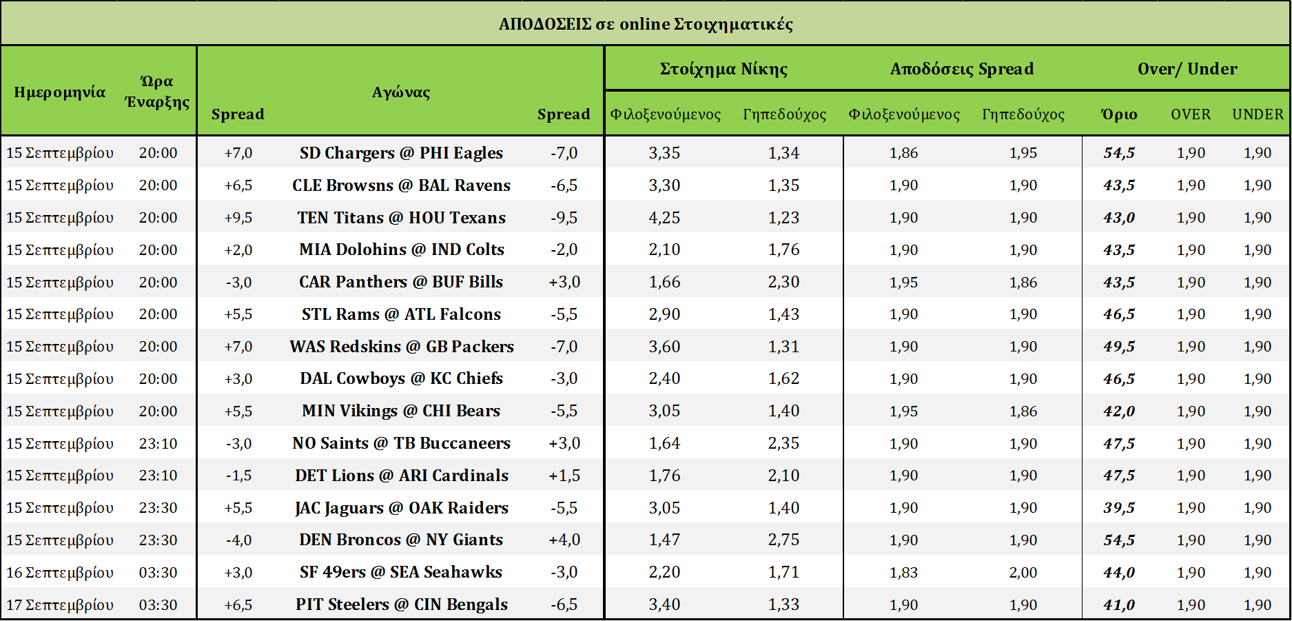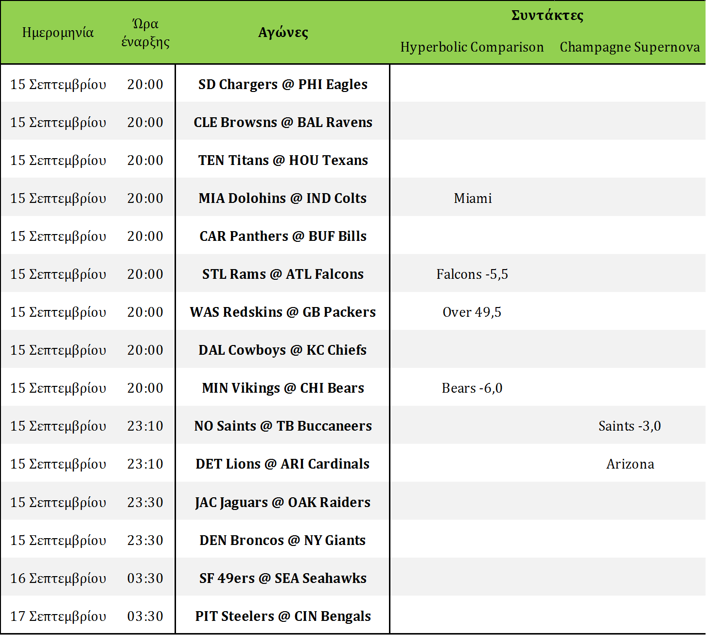 Αρκετά δύσκολη αγωνιστική μιας και οι περισσότεροι νικητές της πρεμιέρας άφησαν ερωτηματικά με την απόδοση τους. Φοβάμαι αρκετά τους Broncos και τους Saints γιατί παίζουν απέναντι σε ομάδες που έχουν καλή άμυνα απέναντι στην πάσα. Το over των Eagles είναι αρκετά υψηλό, ενώ τα περισσότερα από τα υπόλοιπα παιχνίδια είναι ντέρμπι. Θα πόνταρα λοιπόν στις νίκες των γηπεδούχων Bears και Falcons, ενώ στο Redskins-Packers δεν μπορώ να βρω ένα σενάριο που οι δύο επιθέσεις θα πέσουν κάτω από τους 25 πόντους η καθεμία. Η έκπληξη της αγωνιστικής, περιμένω να γίνει στην Ιντιανάπολις, όπου η ομάδα για την οποία δεν μίλησε κανείς την πρώτη αγωνιστική, Miami Dolphins, παίζουν απέναντι στους κακούς Colts της πρώτης αγωνιστικής. Οι Dolphins διαθέτουν pass rush και οι Colts δε διαθέτουν άμυνα. Καλή απόδοση στο 2,1 αλλά για τους ριψοκίνδυνους!Hyperbolic Comparison