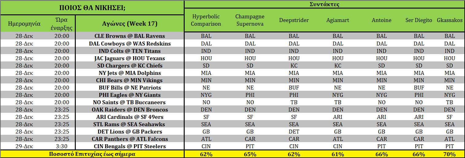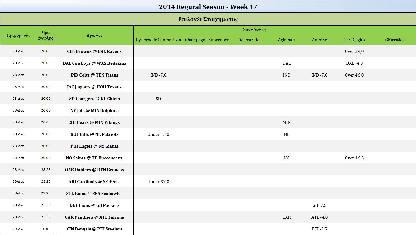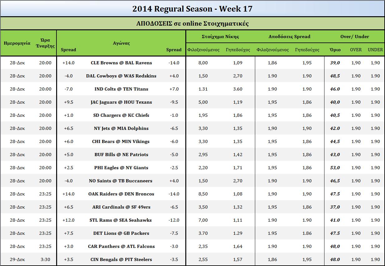 Στοίχημα:Ανάλυση και Προβλέψεις 17ης Αγωνιστικής December 28, 2014 Διαβάστε τις στοιχηματικές προτάσεις και το Weekly Pick’em των συντακτών του NFLgreece, καθώς και τις στοιχηματικές αποδόσεις για τους αγώνες της 17ης αγωνιστικής του NFL. NFLgreece