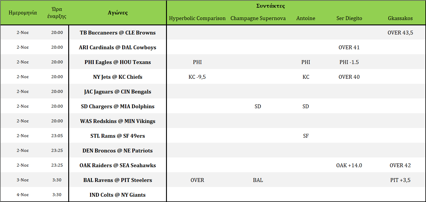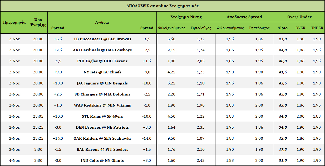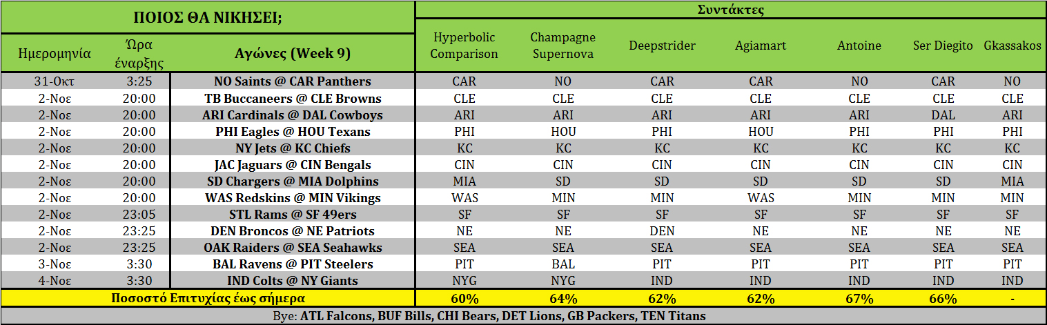 Στοίχημα:Ανάλυση και Προβλέψεις 9ης Αγωνιστικής November 2, 2014 Διαβάστε τις στοιχηματικές προτάσεις και το Weekly Pick’em των συντακτών του NFLgreece, καθώς και τις στοιχηματικές αποδόσεις για τους αγώνες της 9ης αγωνιστικής του NFL. NFLgreece