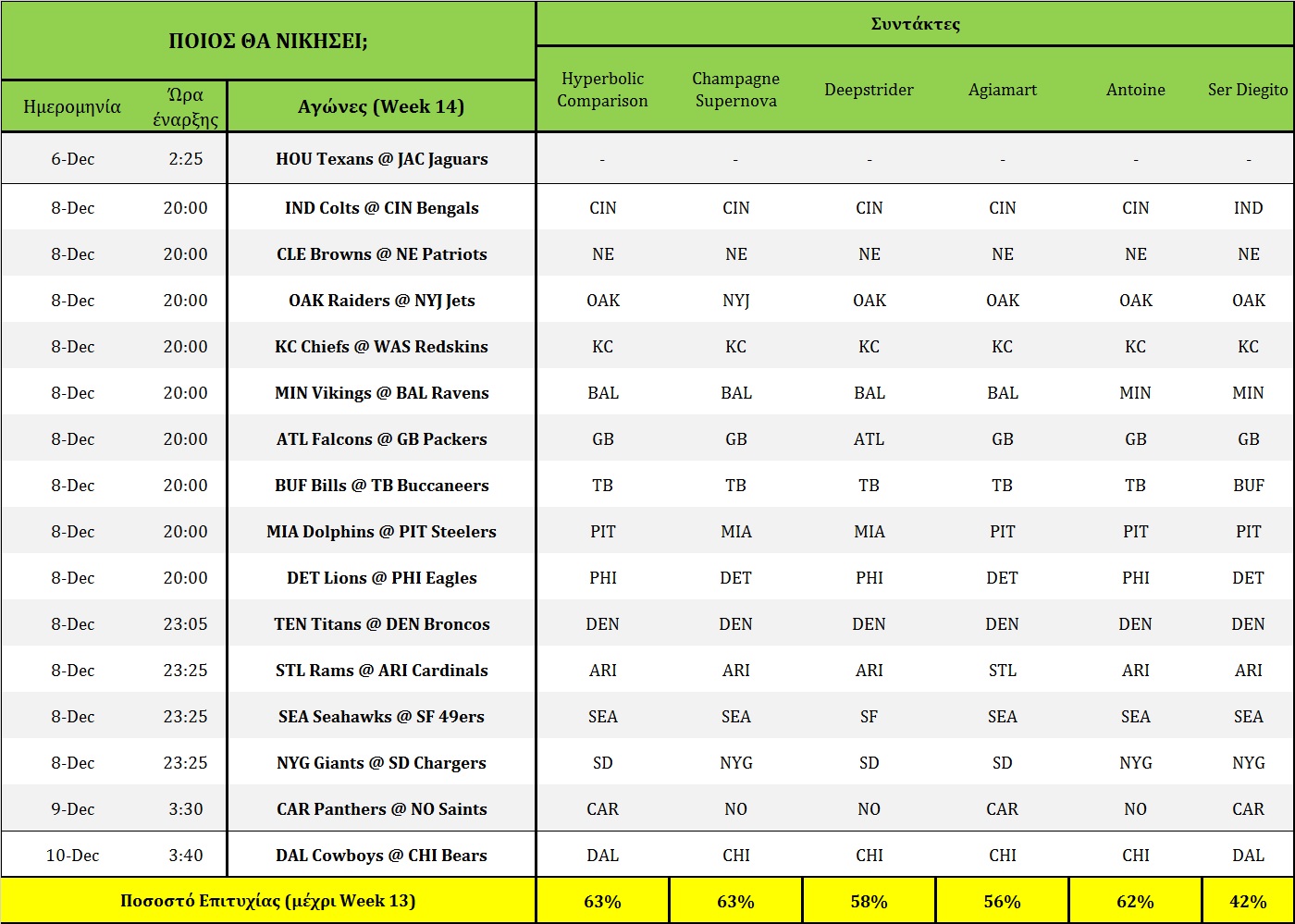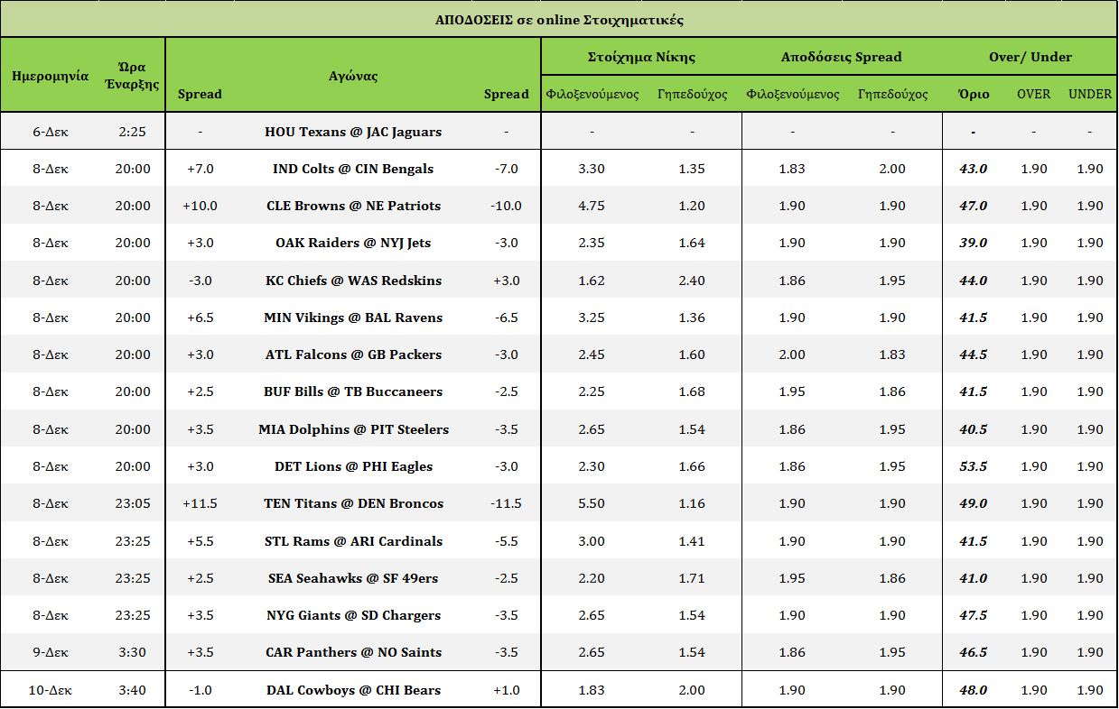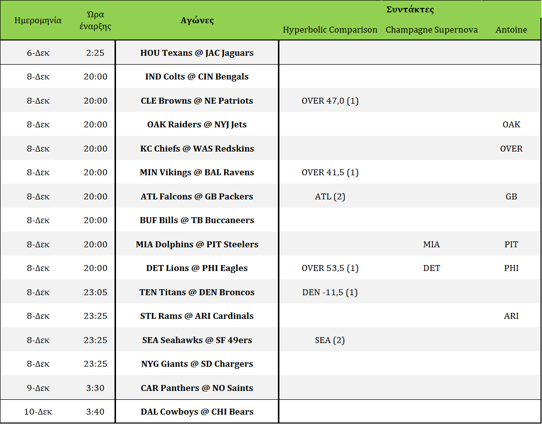 Η προηγούμενη αγωνιστική πήγε πολύ καλά, οπότε με άνεση αυτή την αγωνιστική θα παίξω 2 ομάδες που πιστεύω ότι θα κερδίσουν, αν και οι αποδόσεις δεν τους έχουν φαβορί. Θεωρώ ότι οι Lions μπορούν να σταματήσουν περισσότερες φορές τους Eagles, ενώ το Miami είναι σε must win φάση απέναντι στους Steelers και θεωρώ ότι θα τα καταφέρουν έστω και δύσκολα. Αν θέλουν να θεωρούν ότι θα κερδίσουν την 6η θέση στα playoff.