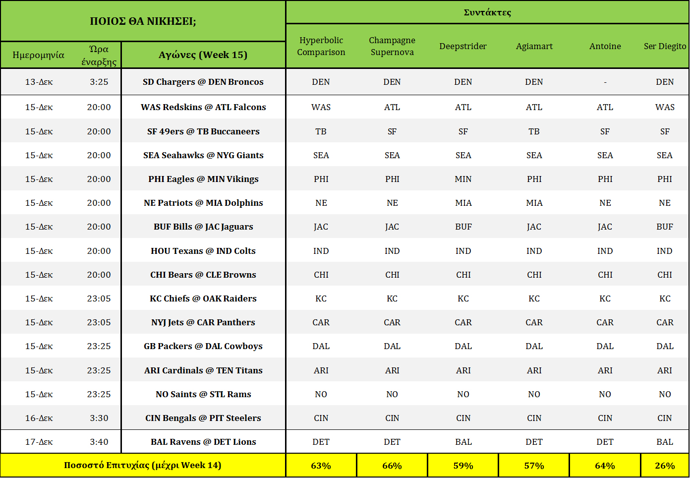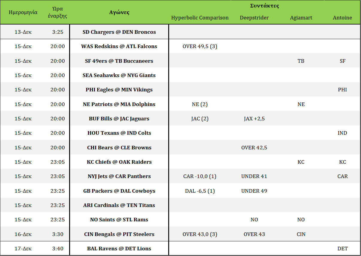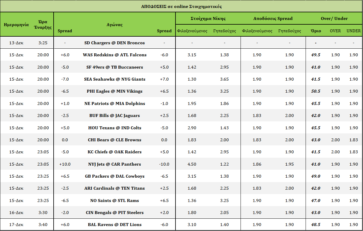Στοίχημα: Ανάλυση και Προβλέψεις 15ης αγωνιστικής December 15, 2013 Δείτεε τί προτείνουν για ποντάρισμα οι συντάκτες του NFLgreece για τους αγώνες της 15ης αγωνιστικής, όπως επίσης τον πίνακα αποδόσεων αλλά και το εβδομαδιαίο PickEm. NFLgreece