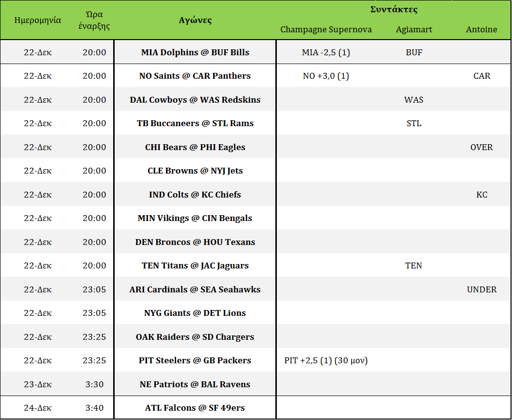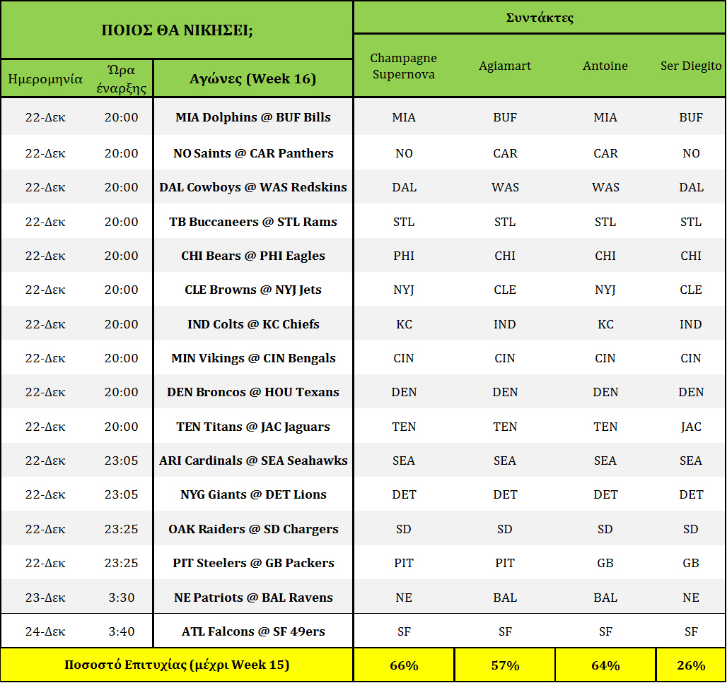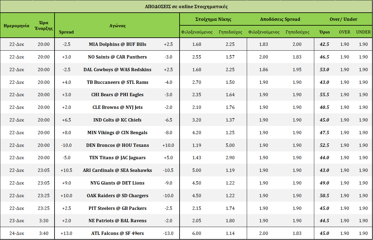 Στοίχημα: Ανάλυση και Προβλέψεις 16ης αγωνιστικής December 22, 2013 Δείτε τί προτείνουν για ποντάρισμα οι συντάκτες του NFLgreece για τους αγώνες της 16ης αγωνιστικής, όπως επίσης τον πίνακα αποδόσεων αλλά και το εβδομαδιαίο PickEm. NFLgreece