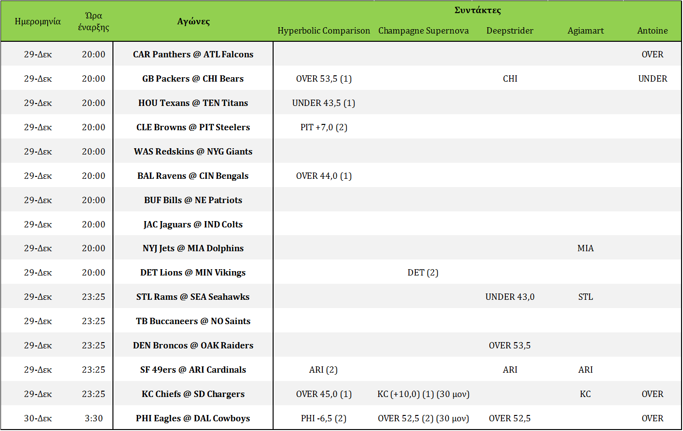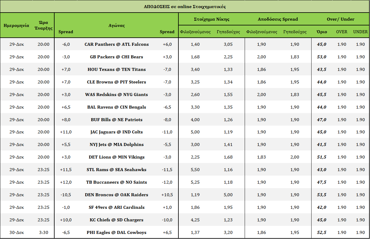 Τελευταία αγωνιστική της κανονικής περιόδου σήμερα, κάτι που σημαίνει ότι από την επόμενη εβδομάδα που θα αρχίσουν τα playoffs θα υπάρχουν όλο και λιγότεροι διαθέσιμοι αγώνες για στοιχηματισμό. Στην προσπάθεια μου να κλείσω έναν αναμφίβολα κακή στοιχηματικά σεζόν με τον καλύτερο τρόπο θα προτείνω δύο σειρές στοιχήματος. Στο πρώτο κουπόνι, το over στο GB@CHI είναι ότι πιο σίγουρο υπάρχει στο μενού της εβδομάδας με τις δύο ομάδες να μπορούν να σκοράρουν και να μην μπορούν να μαρκάρουν. Αυτό δεν ισχύει όμως και για τα δύο άλλα OVER του πρώτου κουπονιού, αυτά μεταξύ των Chiefs και των Chargers και των Ravens και των Bengals. Οι τέσσερις αυτές ομάδες δεν είναι σταθερές επιθετικά, αλλά επειδή γνωρίζουν η μία την άλλη το σκορ αναμένεται να είναι υψηλό όπως και στα πρώτα παιχνίδια μεταξύ των ομάδων αυτών. Κλείνοντας στο πρώτο κουπόνι οι τραγικοί επιθετικά Texans παίζουν με τους Titans που βασίζονται στο run για να σκοράρουν. Η καλή front 7 του Houston αναμένεται να περιορίσει τους Titans και το συνολικό σκορ του παιχνιδιού.