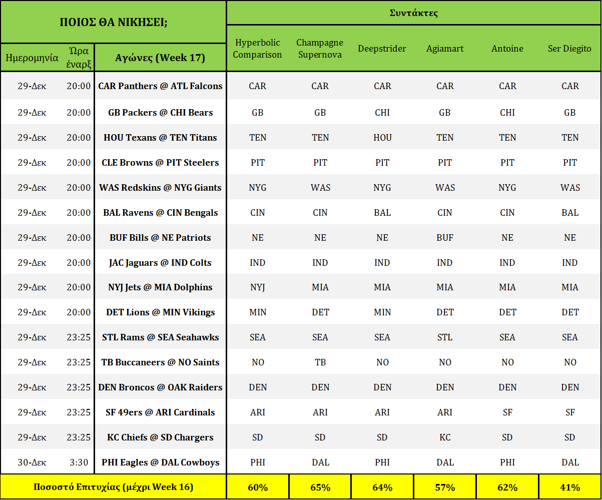 Δείτε τί προτείνουν για ποντάρισμα οι συντάκτες του NFLgreece για τους αγώνες της 17ης αγωνιστικής, όπως επίσης τον πίνακα αποδόσεων αλλά και το εβδομαδιαίο PickEm: