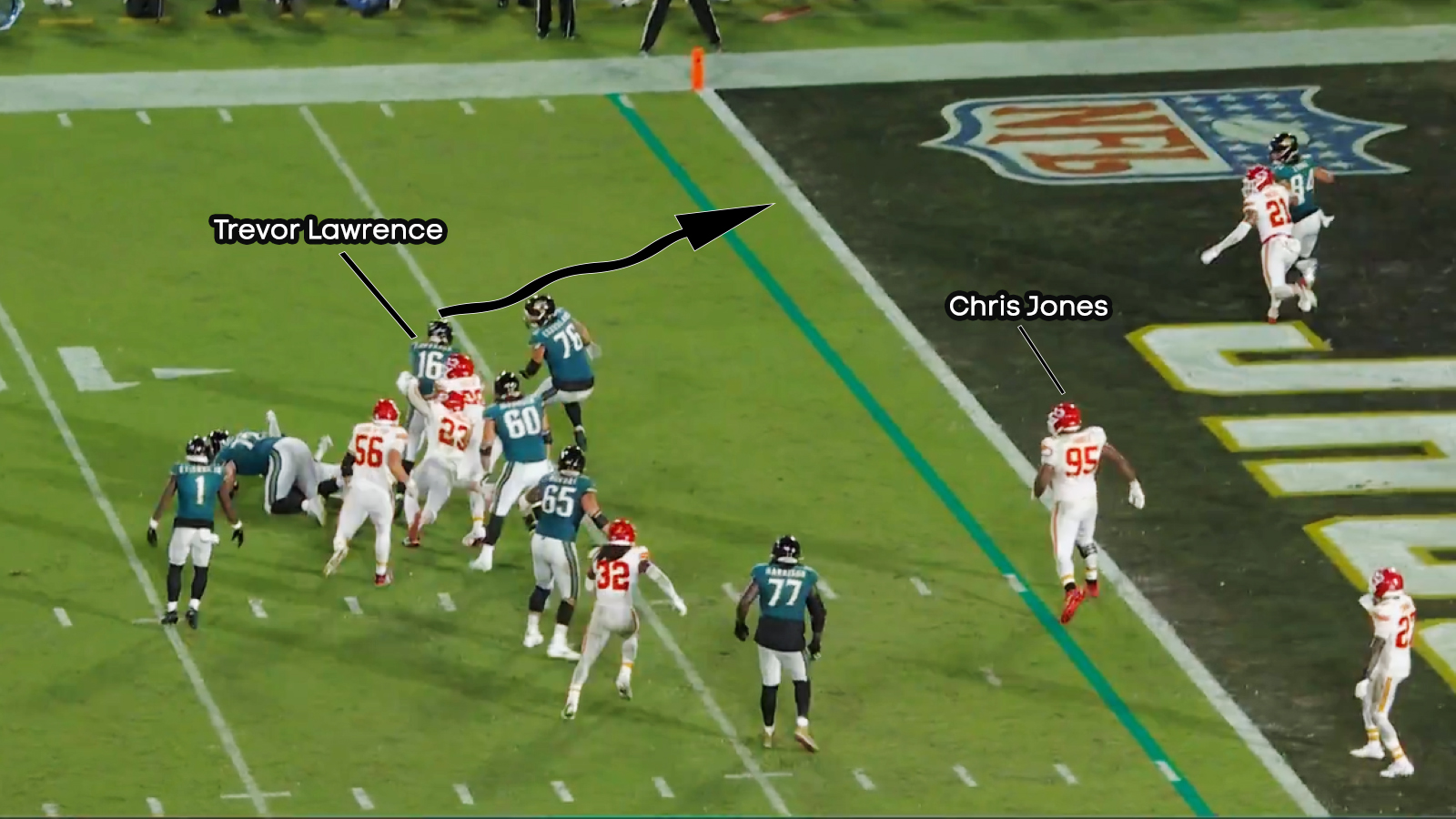 O Chris Jones (95) αφήνει τον T. Lawrence (16) να τρέξει ανενόχλητος στην end zone