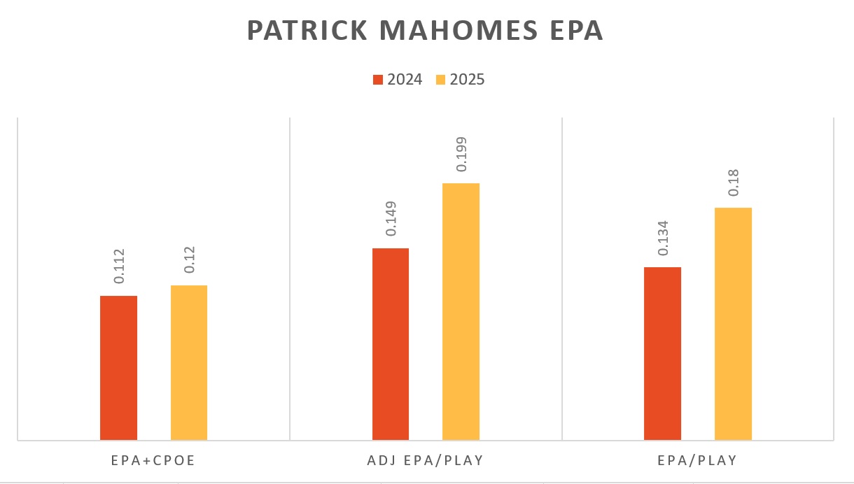 Σε αυτό το σημείο, πρέπει να πούμε ότι η φετινή εικόνα δεν ήταν λόγω κακής ποιότητας παιχνιδιού από τον δις MVP, Patrick Mahomes. Τουναντίον, τα στατιστικά μαρτυρούν ότι φέτος έπαιξε λίγο καλύτερα από πέρσι ή, στην καλύτερη, διατήρησε την απόδοσή του. Στα advanced analytics, είδε μία ελάχιστη, αλλά παρόλα αυτά σημαντική, αύξηση στο EPA του, όπως φαίνεται στον παρακάτω πίνακα. Για όσους δεν θυμούνται το EPA, είναι ένα στατιστικό που μετράει κατά πόσο η απόδοση ενός παίκτη προσμετράει στην απόκτηση πόντων, παίρνοντας υπόψιν το μέσο όρο των περιπτώσεων ανά τα χρόνια. Μπορείτε να βρείτε μία εκτενέστερη εξήγηση εδώ. Ουσιαστικά, αυτό σημαίνει ότι κάθε φάση που έκανε ο πασαδόρος του Κάνσας, οδηγούσε στην απότηση περισσότερων πόντων από ό,τι πέρσι.