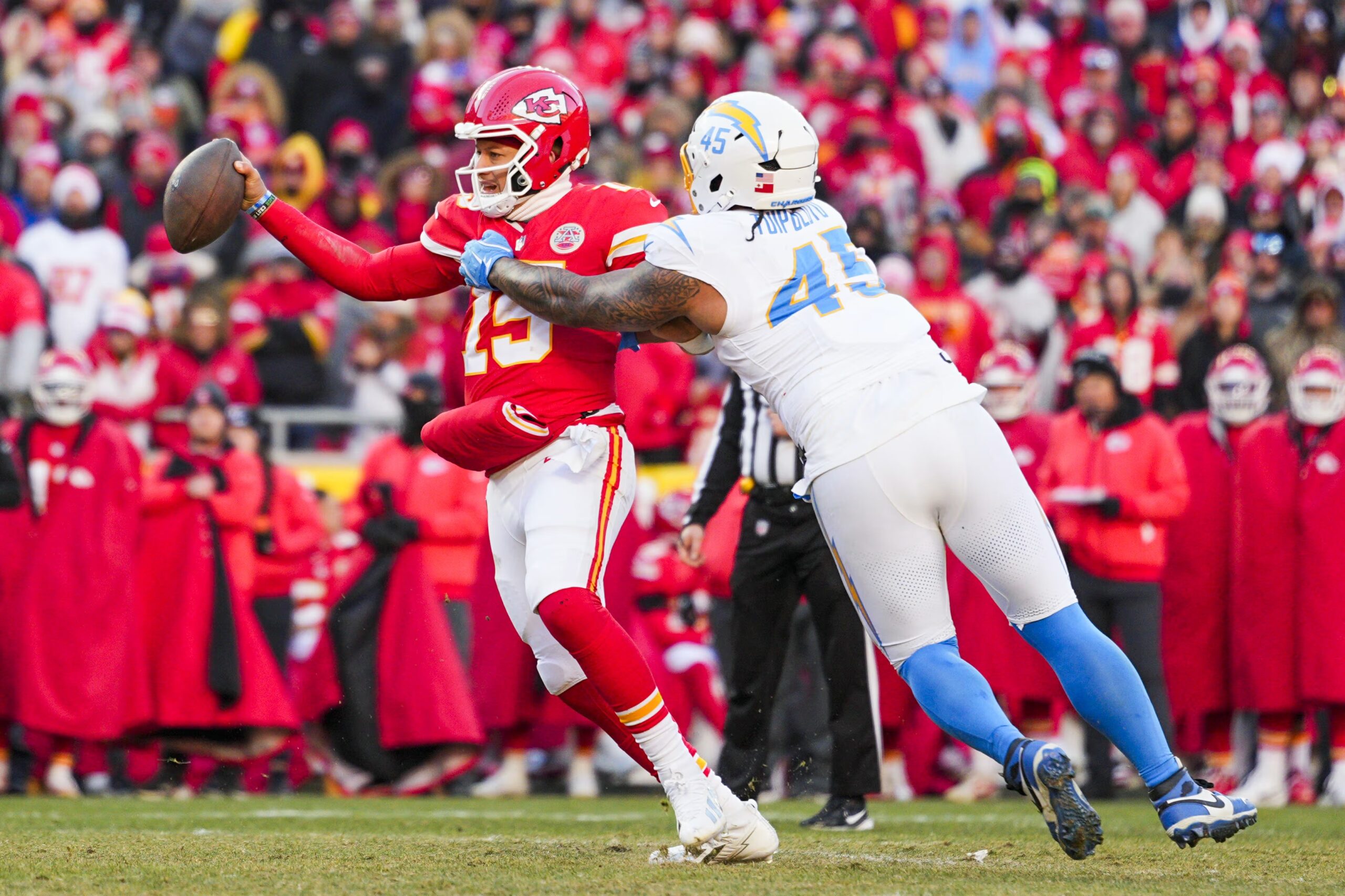 O Mahomes υπό πολιορκία από τον Tuli Tuipulotu (45) των Chargers